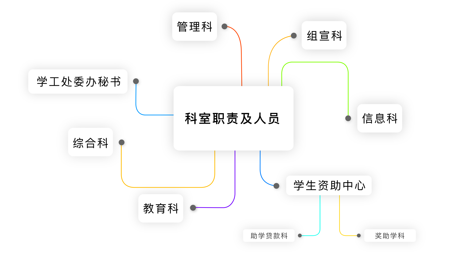 科室设置为:学工委办秘书、综合科、学生教育科、学生管理科、组织宣传科、信息科,学生资助中心(下设奖助学科、助学贷款科)。