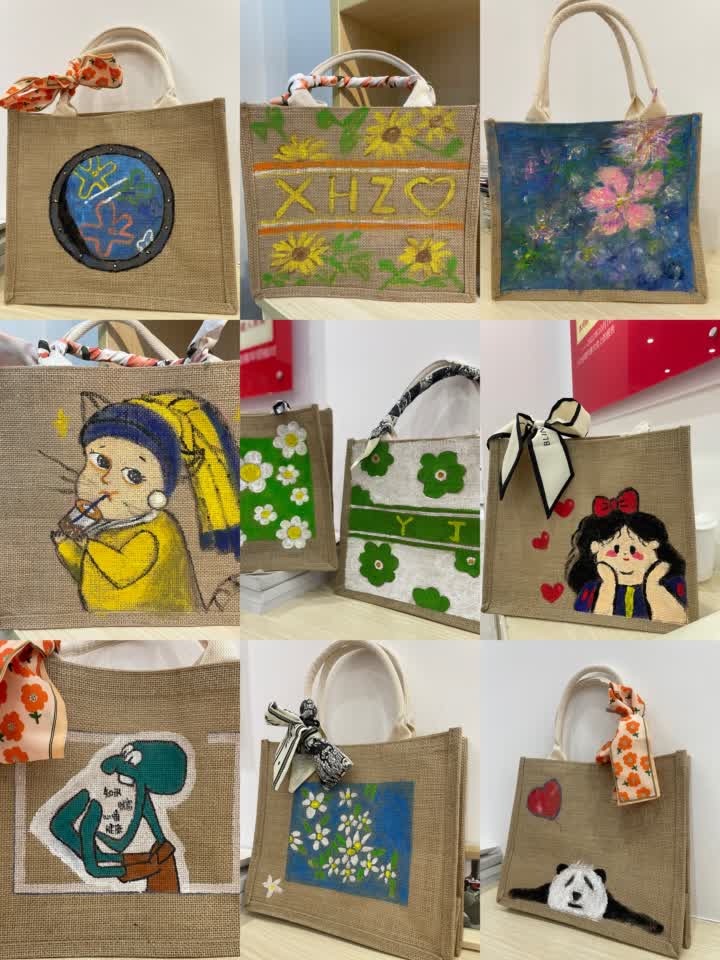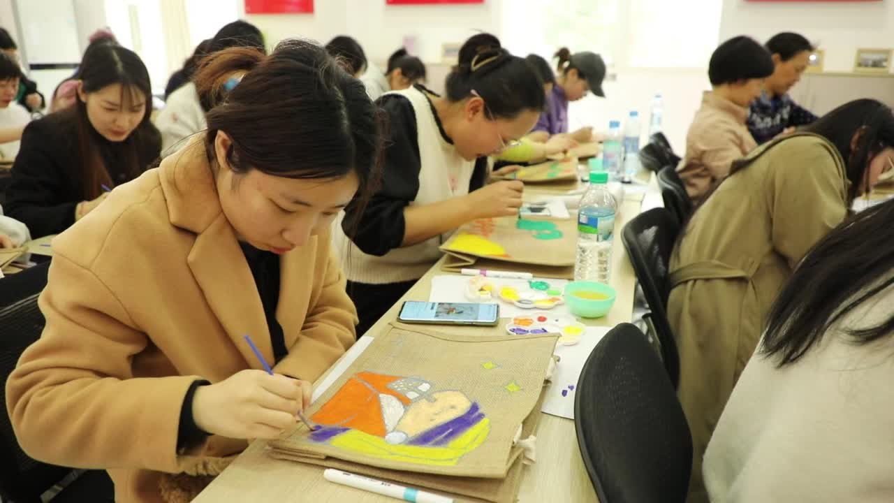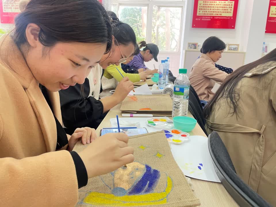活动现场轻松愉快,与会老师热情高涨。大家在黄老师的精心指导下,一边学习手绘技巧,一边构思心仪图案。经过一笔一划彩绘,各色形态生动的艺术造型跃然于之前素面的托特包上。